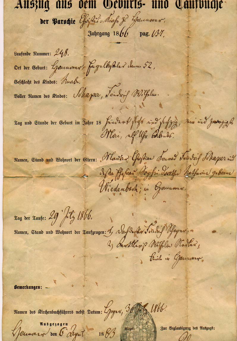 | Wilhelm Schaper Birth Document This is the orginal source document used for immigration to the United States in 1883. |
