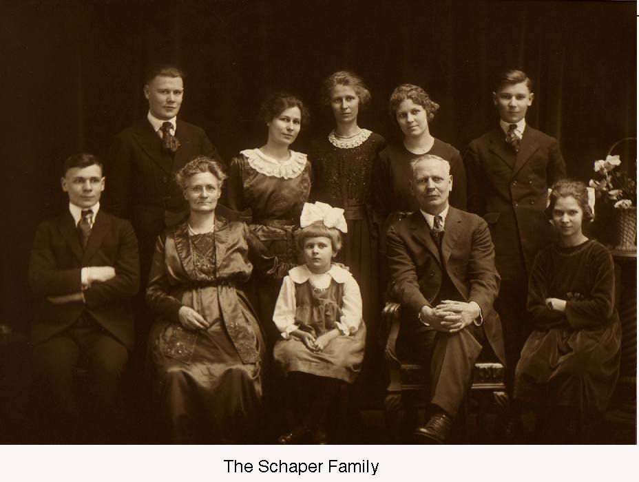 | William Scaper & Family abt. 1920 Take in Illinois, this shows all the family members: L-R Front Row: Son, Frank Schaper, Wife Fransciska, Daughter May Schpaer, Father William Schaper, Daugher Clara Schaper. L-R Back Row: Son, William Schaper, Daughter, Caroline Schaper, Daughter, |
