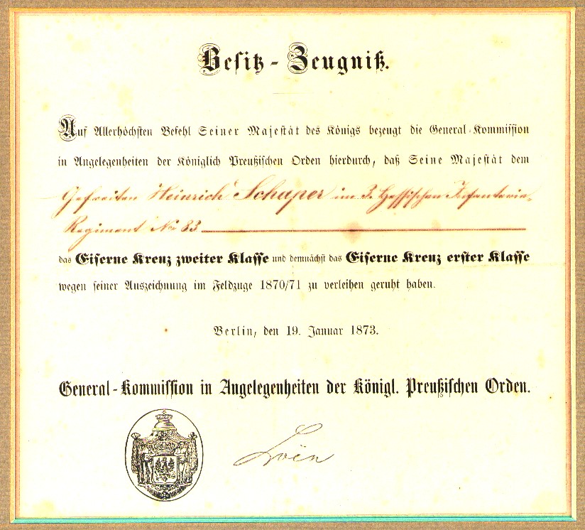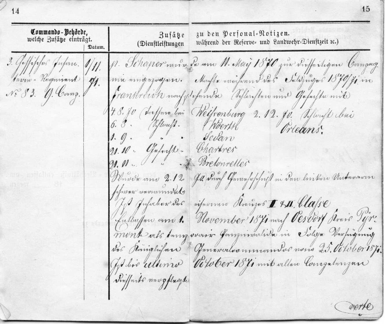 p. Schaper wurde am 11. May 1870 zur diesseitigen Compag. nie eingezogen. Machte während des Feldzuges 1870/71 in Frankreich nachgehende Schlachten und Gefechte mit: 4.8.70 Treffen bei Weissenburg [2.12.70 Schlacht bei Orleans; diese Schlacht wurde später Loigny-Poupry zugeordnet.] (Anmerkung: hier zeitlich falsch eingeordnet, oder unten vergessen.) 6.8.70 Schlacht bei Woerth 1.9.70 Schlacht bei Sedan 21.10.70 Gefecht bei Chartres 21.??.70 Gefecht bei Bretoncelles Wurde am 2.12.70 durch Gewehrschuß in den linken Unterarm schwer verwundet. Ist Inhaber des eisernen Kreuzes I. & II. Classe. Entlassen am 1. November 1871 nach Oesdorf Kreis Pyr= mont als temporair Ganzinvalide in Folge Verfügung des königlichen Generalcommandos vom 25. October 1871. Ist bis ultimo October 1871 mit alten Competenzen diesseits verpflegt. |
