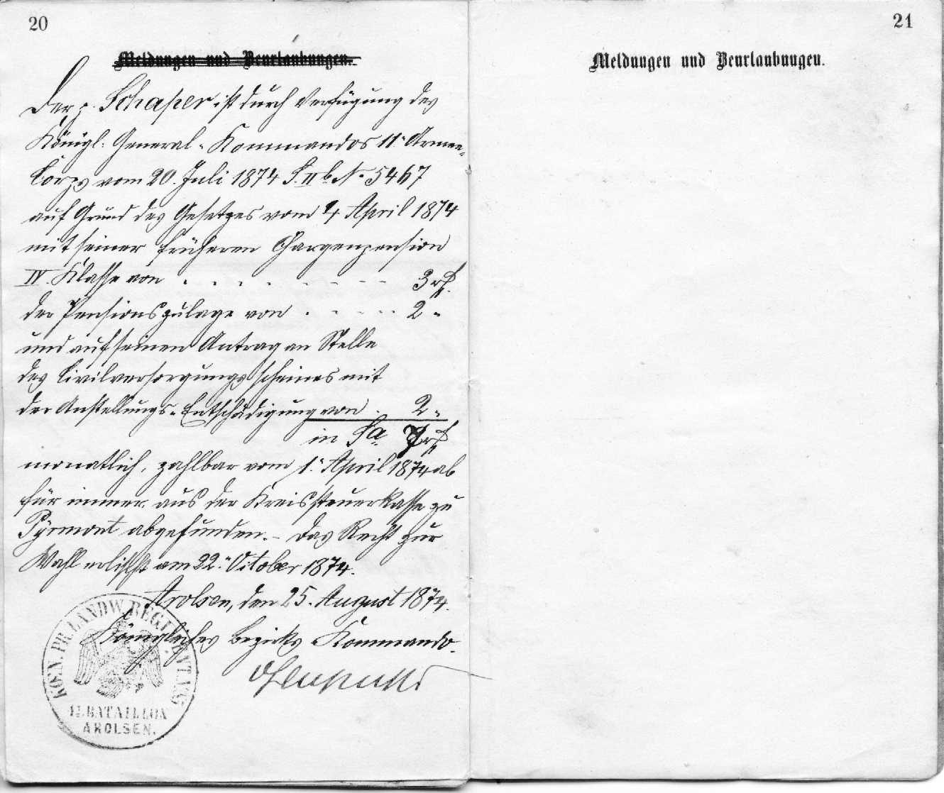 Corps vom 20. Juli 1874 S.II b No 5467